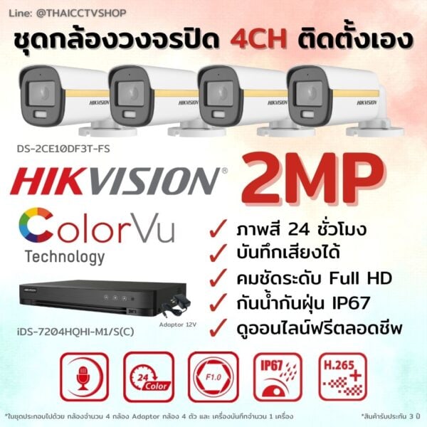 ชุดกล้องวงจรปิด Hikvision colorVu 2mp 4ตัว สำหรับติดตั้งเอง