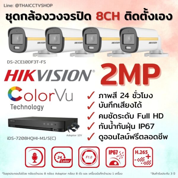 ชุดกล้องวงจรปิด Hikvision colorVu 2ล้านพิกเซล 8ตัว สำหรับติดตั้งเอง
