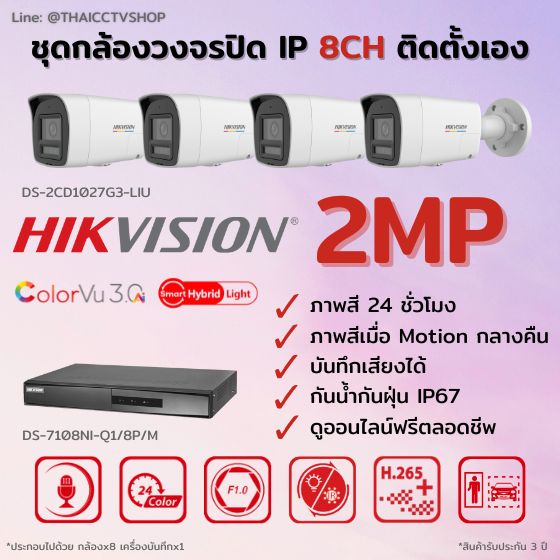 ชุดกล้องวงจรปิด HIKVISION IP ColorVu 3.0 Smart Hybrid Light 4MP 8ตัว ติดตั้งเอง