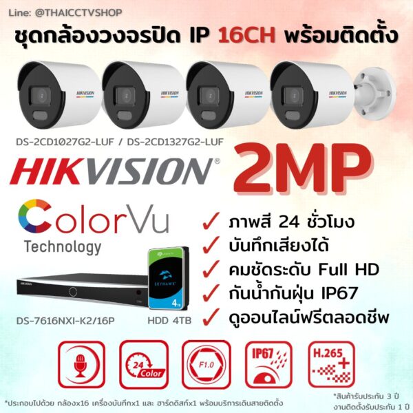 ชุดกล้องวงจรปิด Hikvision IP ColorVu 2mp 16 ตัว บันทึกเสียงได้ พร้อมบริการติดตั้ง
