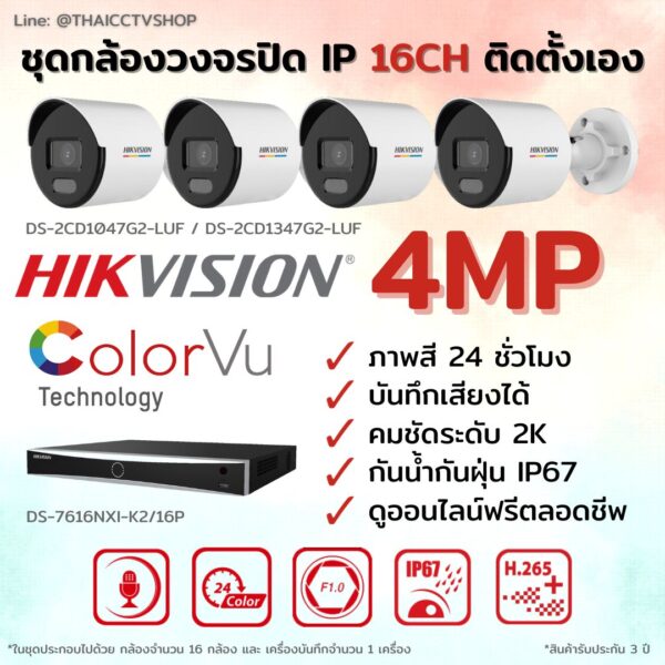 ชุดกล้องวงจรปิด Hikvision IP ColorVu 4mp 16 ตัว บันทึกเสียงได้ สำหรับติดตั้งเอง
