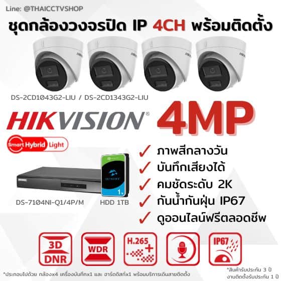 ชุดกล้องวงจรปิด Hikvison IP 4mp 4 ตัว พร้อมบริการติดตั้ง
