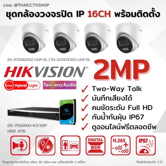 ชุดกล้องวงจรปิด พูดคุยโต้ตอบได้ 16 ตัว Hikvision IP 2mp พร้อมติดตั้ง
